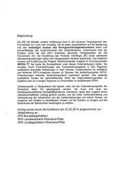 Begründung: Die DB AG betreibt unserer Auffassung nach in der kürzeren Vergangenheit den Fernverkehr nur noch sehr einseitig. Sie ist dabei ausschließlich auf die Bedienung und den einseitigen Ausbau des Hochgeschwindigkeitsverkehrs fixiert und vernachlässige das Zusammenspiel des Gesamtsystems. Untermauert wird die Position durch die seit 2001 sinkenden absoluten Fahrgastzahlen der DB Fernverkehr AG. Die Einstellung des Produkts InterRegio (IR) sowie zahlreiche Streckenreduzierungen ließen die Fahrgastzahlen deutlich einbrechen. Des Weiteren müssen seit Einführung des Projekts “Marktorientiertes Angebot im Personenverkehr (MORA P)“ bis heute die Bundesländer unter diesen Entscheidungen leiden. Sie mussten durch Einschränkungen des Fernverkehrsangebots in den Regionen zusätzliche finanzielle Belastungen in Kauf nehmen. Ersatzverkehre für entfallene und fehlende SPFV-Angebote müssen im Rahmen der länderfinanzierten SPNV- Finanzierungen teilweise länderübergreifend organisiert werden. Das bedeutet zusätzliche Kosten bei gleichbleibender Höhe der Regionalisierungsmittel. Im Ergebnis kam es in einigen Regionen zu Einschnitten im bestehenden SPNV. Schienenpolitik in Deutschland darf jedoch nicht mit der Unternehmenspolitik der Deutschen Bahn AG gleichgesetzt werden. Sie muss sich zwar am betriebswirtschaftlichen Rentabilitätskriterium orientieren, dabei aber zugleich ihrem volkswirtschaftlichen Auftrag gerecht werden, und der heißt: Aufrechterhaltung und Verbesserung der Infrastruktur und der Verkehrsleistungen auf hohem Niveau, um möglichst viel Verkehr zu bezahlbaren Preisen auf die Schiene zu bringen und die Bedürfnisse der Bahnkunden bestmöglich zu erfüllen. Antrag wurde durch die Konferenz am 22.02.2014 angenommen zur Weiterleitung an: SPD Bundestagsfraktion SPD Landesverband Rheinland-Pfalz SPD Landtagsfraktion Rheinland-Pfalz