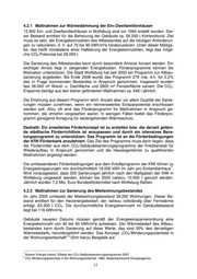 4.2.1 Maßnahmen zur Wärmedämmung der Ein-/Zweifamilienhäuser 12.800 Ein- und Zweifamilienhäuser in Wolfsburg sind vor 1984 erstellt worden. Die- ser Bestand emittiert für die Beheizung der Gebäude ca. 56.000 t Kohlendioxid. Ziel muss es sein, die Energiekennzahlen des Altbestandes auf die heutigen Anforderun- gen zu reduzieren, d. h. auf 70 bis 90 kWh/m²a herabzusetzen. Unter dieser Maßga- be, das heißt mindestens einer Halbierung der Energiekennzahlen, liegt das mögli- che CO2-Potenzial bei 28.000 t. Die Sanierung des Altbestandes kann durch besondere Anreize forciert werden. Ein wichtiger Anreiz liegt in steigenden Energiekosten. Förderprogramme können die Motivation unterstützen. Die Stadt Wolfsburg hat seit 2003 ein Programm zur Altbau- sanierung angeboten. Bis Ende 2008 wurde das Programm 279 mal, d.h. für 2,2% des in Frage kommenden Bestandes in Anspruch genommen. Insgesamt wurden fast 36.000 m² Wand- u. Dachfläche und 2800 m² Fensterfläche saniert. Die CO 2- Ersparnis beträgt aus den bisher geförderten Maßnahmen ca. 646 t jährlich. Die Erfahrung aus diesem Programm lehrt: Anzahl aber vor allem Qualität der Sanie- rungen müssen zunehmen, wenn ein nennenswertes Einsparpotential erschlossen werden soll. Allzu oft wird das Förderprogramm für Maßnahmen in Anspruch ge- nommen, die ohnehin vorgesehen waren. In wenigen Fällen bietet das Förderpro- gramm genügend Anregung für weitergehenden Wärmeschutz. Deshalb: Ein erweitertes Förderkonzept ist zu erstellen bzw. die derzeit gelten- de städtische Förderrichtlinie ist anzupassen und durch ein intensives Bera- tungsprogramm zu unterstützen. Das Programm ist an die Förderbedingungen der KfW-Förderbank anzulehnen. Das Ziel des Programms muss darin liegen, dass die Fördermittel aus dem CO2-Gebäudesanierungsprogramms der Kreditanstalt für Wiederaufbau in Anspruch genommen und die Hauseigentümer zu qualifizierten Maßnahmen angeregt werden. Die umfassenderen Förderbedingungen aus dem Kreditprogramm der KfW führen zu 7 Energieeinsparungen von durchschnittlich 18.000 kWh im Jahr pro Einfamilienhaus . Wird vorausgesetzt, dass 200 Sanierungen jährlich nach den Maßgaben der KfW in Wolfsburg umgesetzt werden, können bis 2020 nahezu 10.500 t genutzt werden. Jährlich würden 7,2 Mio. Euro Bundesfördermittel nach Wolfsburg fließen. 4.2.2 Maßnahmen zur Sanierung des Mietwohnungsbestandes Im Jahr 2000 umfasste der Mietwohnungsbestand 39.200 Wohnungen. Dieser Be- stand emittiert für den Heizenergiebedarf, der nahezu vollständig über Fernwärme erfolgt, 63.300 t CO2. Die durchschnittliche Energiekennzahl im Gebäudebestand liegt bei 116 kWh/m²a. Gebäude neueren Datums müssen gemäß der Energieeinsparverordnung eine Energiekennzahl von 40 bis 60 kWh/m²a aufweisen. Der Wärmebedarf des Altbau- bestandes kann durch Sanierung auf diese Werte, das sind 50% des derzeitigen Wärmebedarfs, heruntergeführt werden. Das Konzept „CO2-Minderungspotentiale in der Wohnungswirtschaft“ führt hierzu Beispiele auf. 8 7 Bremer Energie Institut, Effekte des CO2-Gebäudesanierungsprogramms 2007 8 CO2-Minderungspotentiale in der Wohnungswirtschaft, 1998, Niedersächsische Energieagentur. 12