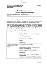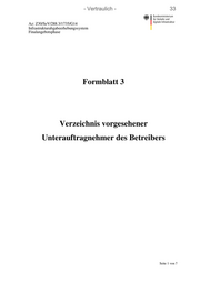 - Vertraulich - 38 Aktenzeichen: Z30/SeV/288.3/1735/G14 Formblatt 3 Infrastrukturabgabeerhebungssystem Finales Angebot 2. Vorgelegte Unterlagen: Erklärung(en) über das Nichtvorliegen von Ausschluss- gründen beim vorgesehenen Unterauftragnehmer des Be- treibers: Formblatt 4 wird vorgelegt Die Erklärung zum Nichtvorliegen von Ausschluss- gründen wurde bereits mit dem Teilnahmeantrag (Form- blatt 10) oder mit dem Erstangebot (Formblatt 4) durch das Unternehmen abgegeben. Weitere Erklärungen: Formblatt 5a der Bewerbungsbedingungen Finale Angebote (Verpflichtungserklärung des Unterauftrag- nehmers) wird vorgelegt. Formblatt 5b der Bewerbungsbedingungen Finale Angebote (Verpflichtungserklärung Mehrfachbeteiligung Unterauftragnehmer) wird vorgelegt (sofern zutreffend). Unterauftragnehmer 5 Name, Anschrift: Sitz/Ort der Hauptniederlassung und - sofern einschlägig - Angaben zur Handelsregistereintragung (Registerge- richt, Abteilung, Nummer) 1. Angaben zum vorgesehenen von zu übernehmenden Leistungen, Unterauftragnehmervertrag: von der vorgesehenen Vertragslaufzeit des voraussichtlichen einmaligen oder jährlichen Auf- tragswerts einmalig: jährlich: Seite 6 von 7