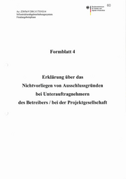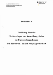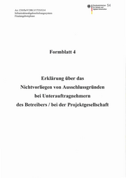Bundesministerium FR für Verkehr und 57 digitale Infrastruktur Az: Z30/SeV/288.3/1735/G14 Infrastrukturabgabeerhebungssystem Finalangebotsphase Formblatt 4 Erklärung über das Nichtvorliegen von Ausschlussgründen bei Unterauftragnehmern des Betreibers / bei der Projektgesellschaft