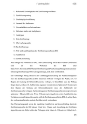 - Vertraulich - 436 1. Rollen und Zuständigkeiten im Zertifizierungsverfahren 2. Zertifizierungsantrag 3. Unabhängigkeitserklärung 4. Auswahl des Auditteams 5. Vertraulichkeit von Informationen 6. Ziel eines Audits und Auditphasen 7. Audittypen 8. Erst-Zertifizierung 9. Überwachungsaudits 10. Re-Zertifizierung 11. Prüf- und Auditbegleitung der Zertifizierungsstelle des BSI 12. Auditbericht 13. Zertifikatserteilung Alle Anträge und Formulare zur ISO 27001-Zertifizierung auf der Basis von IT-Grundschutz sind auf den Webseiten des BSI unter https://www.bsi.bund.de/DE/Themen/ZertifizierungundAnerkennung/Managementsystemzer tifizierung/Zertifizierung27001/Antraege/antraege_node.html veröffentlicht. Der vollständige Antrag inklusive der Unabhängigkeitserklärung der Auditteammitglieder muss der Zertifizierungsstelle des BSI mindestens 1 Monat vor Beginn des Audits, d. h. vor Beginn der Sichtung der Referenzdokumente, vorliegen. In Einzelfällen kann die Prüfung länger dauern, sodass evtl. Audittermine angepasst werden müssen. Spätestens 3 Monate nach dem Beginn der Sichtung der Referenzdokumente muss der Auditbericht der Zertifizierungsstelle vorliegen. Nachforderungen der Zertifizierungsstelle müssen jeweils nach spätestens 1 Monat erfüllt sein. Wenn 3 Monate nach Abgabe des ersten Auditberichts das Verfahren noch nicht abgeschlossen ist, prüft die Zertifizierungsstelle des BSI, ob auf der Basis des vorliegenden Berichts noch ein Zertifikat erteilt werden kann. Das Überwachungsaudit sowie der zugehörige Auditbericht und dessen Prüfung durch die Zertifizierungsstelle des BSI müssen 1 Jahr bzw. 2 Jahre nach Ausstellung des Zertifikates abgeschlossen sein. Dabei sollten die Prüfungen nicht früher als 3 Monate vor Ablauf des 1. 286