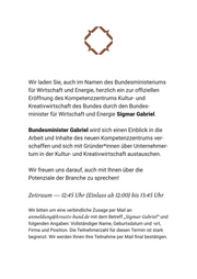 Wir laden Sie, auch im Namen des Bundesministeriums für Wirtschaft und Energie, herzlich ein zur offiziellen Eröffnung des Kompetenzzentrums Kultur- und Kreativwirtschaft des Bundes durch den Bundes- minister für Wirtschaft und Energie Sigmar Gabriel. Bundesminister Gabriel wird sich einen Einblick in die Arbeit und Inhalte des neuen Kompetenzzentrums ver- schaffen und sich mit Gründer*innen über Unternehmer- tum in der Kultur- und Kreativwirtschaft austauschen. Wir freuen uns darauf, auch mit Ihnen über die Potenziale der Branche zu sprechen! Zeitraum — 12:45 Uhr {Einlass ab 12:00} bis 13:45 Uhr Wir bitten um eine verbindliche Zusage per Mail an anmeldung@kreativ-bund.de mit dem Betreff „Sigmar Gabriel“ und folgenden Angaben: Vollständiger Name, Geburtsdatum und -ort, Firma und Position. Die Teilnehmerzahl für diesen Termin ist stark begrenzt. Wir werden Ihnen Ihre Teilnahme per Mail final bestätigen.