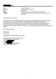 , VIA Von: Fischer, Frank, VIA5 Gesendet: Donnerstag, 26. Mai 2016 16:10 An: BUERO-VIA5 Betreff: Wettbewerb Kultur- und Kreativpiloten Deutschland 2016 Anlagen: 0517 PM Wettbewerb Kultur- und Kreativpiloten Deutschland 2016 ist eröffnet.pdf Sehr geehrte Damen und Herren, vor wenigen Tagen ist der Wettbewerb Kultur- und Kreativpiloten Deutschland 2016 gestartet. Gesucht werden wieder kreative Unternehmerpersönlichkeiten mit ausgefallenen und innovativen Geschäftsideen. 32 Preisträgerinnen und Preisträger dürfen sich im November 2016 auf die Übergabe der Auszeichnung in Berlin freuen. Ich möchte Sie bitten, in geeigneter Weise über Ihre Verteiler und Netzwerke auf den Wettbewerb aufmerksam zu machen. Weiter Informationen finden Sie unter http://kultur-kreativpiloten.de. Vielen Dank für Ihre Mithilfe. Mit freundlichen Grüßen Frank Fischer Ministerialrat __________________________ Leiter Referat VIA5 - Kultur- und Kreativwirtschaft Bundesministerium für Wirtschaft und Energie Scharnhorststr. 34-37, D-10115 Berlin Telefon: FAX: E-Mail: @bmwi.bund.de Internet: http:/www.bmwi.de 1