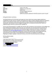 VIA Von: Fischer, Frank, VIA5 Gesendet: Mittwoch, 1. Juni 2016 09:21 An: BUERO-VIA5 Betreff: Grünbuch Digitale Plattformen Anlagen: gruenbuch-digitale- plattformen,property=pdf,bereich=bmwi2012,sprache=de,rwb=true.pdf Sehr geehrte Damen und Herren, das Bundesministerium für Wirtschaft und Energie hat in dieser Woche das Grünbuch Digitale Plattformen veröffentlicht, mit dem zentrale, rechtliche und regulatorische Fragen im Rahmen digitaler Plattformen identifiziert, definiert und strukturiert werden sollen. Dazu startet ein breiter, öffentlicher Online-Beteiligungsprozess für Interessierte. Das Grünbuch ist Teil der 'Digitalen Strategie 2025', die Bundeswirtschaftsminister Gabriel zur Digitalisierung der deutschen Volkswirtschaft vorgelegt hat. Ziel ist, einen Ordnungsrahmen zu schaffen, der einerseits mehr Investitionen und Innovationen auf Grundlage eines fairen Wettbewerbs ermöglicht, andererseits aber auch individuelle und unternehmerische Grundrechte und Datensouveränität sichert. Zwölf Thesen und 52 konkrete Fragen strukturieren den Prozess. Auf dem Online- Beteiligungsportal http://de.digital/gruenbuch können sich Bürger, Unternehmen, Verbände und Experten informieren und bis 30. September ihre Meinung zu Themen wie Suchmaschinen, Bewertungsportalen oder personalisierten Preisen äußern. Darauf aufbauend wird Anfang 2017 ein Weißbuch mit konkreten Regelungsvorschlägen vorgelegt. Ich lade Sie herzlich an, sich an dem Konsultationsprozess zu beteiligen. Mit freundlichen Grüßen Frank Fischer __________________________ Leiter Referat VIA5 - Kultur- und Kreativwirtschaft Bundesministerium für Wirtschaft und Energie Scharnhorststr. 34-37, 10115 Berlin Tel:+ E-Mail: @bmwi.bund.de Internet: http://www.bmwi.bund.de 1