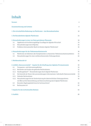 Inhalt Vorwort 4 Zusammenfassung und Leitsätze 8 1. Die wirtschaftliche Bedeutung von Plattformen – eine Bestandsaufnahme 18 2. Die Besonderheiten digitaler Plattformen 24 3. Herausforderungen in einer von Daten getriebenen Ökonomie 30 3.1 Gigabitnetze als hochleistungsfähige Grundlage der digitalen Wirtschaft 33 3.2 Herausforderungen durch Big Data 34 3.3 Probleme informationeller Macht im Kontext digitaler Plattformen? 36 4. Herausforderungen für das Telekommunikationsrecht 38 4.1 Plattformen als Substitute oder Komplementäre zu klassischen Telekommunikationsanbietern 41 4.2 Herausforderungen für einen wettbewerbsneutralen Ordnungsrahmen 42 5. Wettbewerbsrecht 4.0 44 6. Leitbild „Datensouveränität“ – Impulse für die Schaffung einer digitalen Privatautonomie 50 6.1 Transparenz- und Informationspflichten 52 6.1.1 Reichweite und Analyse des geltenden Rechtsrahmens 52 6.1.2 Handlungsbedarf? – Herausforderungen durch digitale Plattformen 53 6.2 Die Kontrolle der Nutzer über personenbezogene Informationen: Individuelle Datensouveränität 54 6.2.1 Geltender Rechtsrahmen 54 6.2.2 Herausforderungen bei der Konkretisierung des datenrechtlichen Ordnungsrahmens 56 mit Blick auf die Datenerhebung und Datenverarbeitung durch digitale Plattformen 6.3 Besondere Regelungsbedürfnisse bei Suchmaschinen? 62 6.4 Rechtssystem 4.0 63 7. Impulse für den institutionellen Rahmen 64 8. Ausblick 68 BMWi_Gruenbuch_A4_ICv2_RZ03.indd 3 27.05.16 08:30