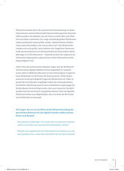 • Was sagen Umsatzerlöse über einen Anbieter aus, dessen Geschäftsmodell im Kern Daten und nicht Entgelte sind? • Wie lässt sich verhindern, dass sich Märkte aufgrund von Datenkonzentrationen verschließen? • Wie stellen wir auf einem gemeinsamen Markt einheitliche Wettbewerbsbedingungen her, damit Online- und Offline-Akteure auf Augenhöhe konkurrieren können? • Wie verhindern wir Preisdiskriminierung und Preisdiktat? • Wie kommen wir Datenmissbrauch auf die Spur, und wie verhindern und sanktionieren wir ihn? • Was müssen wir tun, damit sich Unternehmen effektiv vor Wirt- schaftsspionage, Daten- und Know-how-Diebstahl schützen können? • Wie bringen wir auch Plattformanbieter dazu, ihren Beitrag zum Aufbau der notwendigen digitalen Anschlüsse zu leisten, wo diese doch die Grundlage ihres Geschäftsmodells sind, obwohl sie selbst meist keine Anschlussinfrastruktur („letzte Meile“) besitzen? • Was müssen wir tun, damit auch Plattformen, die nicht selbst anbieten, sondern lediglich vermitteln, stärker in die Verantwortung für Entlohnungs- und Arbeitsbedingungen genommen werden? • Wie sichern wir effektiv weitere grundlegende Rechte, wie z. B. das Urheberrecht, das Recht auf informationelle Selbstbestimmung, das Recht auf Vergessen usw. ? • Wie stellen wir eine schnellere regulatorische Reaktionszeit her, die mit der Schnelligkeit digitaler Entwicklungen Schritt hält? • Wie stellen wir sicher, dass Verbraucherinnen und Verbraucher souve- rän im Umgang mit ihren persönlichen Daten sind und bleiben? Das schließt auch ein, dass sie darüber verfügen können, wer im Besitz ihrer Daten ist. 6 BMWi_Gruenbuch_A4_ICv2_RZ03.indd 6 27.05.16 08:30