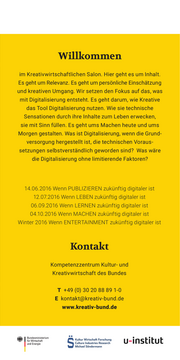 Willkommen im Kreativwirtschaftlichen Salon. Hier geht es um Inhalt. Es geht um Relevanz. Es geht um persönliche Einschätzung und kreativen Umgang. Wir setzen den Fokus auf das, was mit Digitalisierung entsteht. Es geht darum, wie Kreative das Tool Digitalisierung nutzen. Wie sie technische Sensationen durch ihre Inhalte zum Leben erwecken, sie mit Sinn füllen. Es geht ums Machen heute und ums Morgen gestalten. Was ist Digitalisierung, wenn die Grund- versorgung hergestellt ist, die technischen Voraus- setzungen selbstverständlich geworden sind? Was wäre die Digitalisierung ohne limitierende Faktoren? 14.06.2016 Wenn PUBLIZIEREN zukünftig digitaler ist 12.07.2016 Wenn LEBEN zukünftig digitaler ist 06.09.2016 Wenn LERNEN zukünftig digitaler ist 04.10.2016 Wenn MACHEN zukünftig digitaler ist Winter 2016 Wenn ENTERTAINMENT zukünftig digitaler ist Kontakt Kompetenzzentrum Kultur- und Kreativwirtschaft des Bundes T +49 (0) 30 20 88 89 1-0 E kontakt@kreativ-bund.de www.kreativ-bund.de