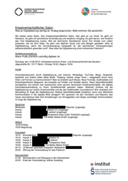 Kreativwirtschaftlicher Salon Was an Digitalisierung wichtig ist. Analog besprochen. Bitte kommen Sie persönlich. Wir starten einen Salon. Den Kreativwirtschaftlichen Salon. Hier geht es um Inhalt. Es geht um Relevanz. Es geht um persönliche Einschätzung und kreativen Umgang. Es geht darum, wie Kreative das Tool Digitalisierung nutzen. Wie sie technische Sensationen durch ihre Inhalte zum Leben erwecken, sie mit Sinn füllen. Es geht ums Machen heute und ums Morgen gestalten. Was ist Digitalisierung, wenn die Grundversorgung hergestellt ist, die technischen Voraussetzungen selbstverständlich geworden sind? Was wäre die Digitalisierung ohne limitierende Faktoren? Auftaktveranstaltung Wenn PUBLIZIEREN zukünftig digitaler ist Dienstag, den 14.06.2016 | Kompetenzzentrum Kultur- und Kreativwirtschaft des Bundes | Jägerstraße 65 | 10117 Berlin | Einlass 18:30 | Beginn 19:00 Inhalt Informationstsunami durch Digitalisierung und Internet. WhatsApp, YouTube, Blogs, Snapchat, facebook und andere reiten diese Welle. Tiefgang, Details, lange Texte – weggespült durch neue Arten und Formen zu kommunizieren? Aber es entsteht auch Neues. Neue Formate, multimediale und themenspezifische Magazine, die komplett auf Inhalte und Qualität setzen. Neue Geschäftsmodelle ermöglichen und sichern das Auskommen einer ganzen Generation Kreativwirtschaftler, die digitale Informationsvermittlung zu Ihrem Schaffensinhalt gemacht haben. Welchen Einfluss hat die Digitalisierung auf unsere Ausdruckmittel und die des traditionellen Journalismus? Wie verändert sich Storytelling im Zuge der Digitalisierung? Welche Geschäftsmodelle entstehen, wenn sich öffentliche Kommunikation in die digitale Welt verlagert? Wir sprechen mit den Vorreitern und Machern des neuen Journalismus über Ihre Vorstellungen von Armageddon und Utopia zukünftiger Kommunikation im Zuge der Digitalisierung. Sprecher Moderator: Reporter (zugesagt) Impuls: detektor.fm (zugesagt) Impuls: , editionf (angefragt) Impuls: Perspective Daily (unter Vorbehalt zugesagt) Impuls: , Fail Better Media GmbH (zugesagt) Ablauf 18:30 Einlass 19:00 Begrüßung Impulsteil 19:10 Anmoderation: Reporter (zugesagt) 19:15 Impuls 1: , detektor.fm 19:25 Impuls 2: , editionf 19:40 Impuls 3: , Perspective Daily 19:55 Impuls 4: , Fail Better Media GmbH 20:10 15 Minuten geleitetes Gespräch. Moderation . 20:25 Öffnung der Veranstaltung für das Publikum. Netzwerkteil 21:00 Abmoderation und Übergang in den Netzwerkteil 22:00 Ende der Veranstaltung, offener Ausklang