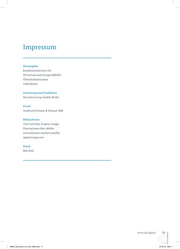 Impressum Herausgeber Bundesministerium für Wirtschaft und Energie (BMWi) Öffentlichkeitsarbeit 11019 Berlin Gestaltung und Produktion Hirschen Group GmbH, Berlin Druck AusDruck Schaare & Schaare GbR Bildnachweis Titel und Seite 24 getty images Illustrationen Herr Müller www.behance.net/herrmueller upperorange.com Stand Mai 2016 www.de.digital 71 BMWi_Gruenbuch_A4_ICv2_RZ03.indd 71 27.05.16 08:31