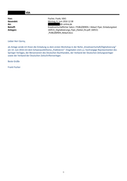 VIA Von: Fischer, Frank, VIA5 Gesendet: Montag, 6. Juni 2016 12:38 An: @t-online.de Betreff: Kreativwirtschaftlicher Salon / PUBLIZIEREN / Ablauf, Flyer, Einladungstext Anlagen: 160531_Digitalisierungs_Flyer_2Seiten_fin.pdf; 160531 _PUBLIZIEREN_Ablauf.docx Lieber Herr Gorny, als Anlage sende ich Ihnen die Einladung zu dem ersten Workshop in der Reihe „Kreativwirtschaft/Digitalisierung“ am 14. Juni 2016 mit dem Schwerpunktthema „Publizieren“. Eingeladen sind u.a. hochrangige Repräsentanten des Springer Verlages, der Börsenverein des Deutschen Buchhandels, der Verband der Deutschen Zeitungsverleger sowie der Verband der Deutschen Zeitschriftenverleger. Beste Grüße Frank Fischer 1