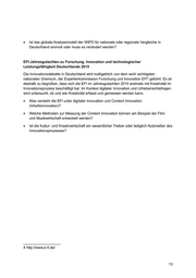 Ist das globale Analysemodell der WIPO für nationale oder regionale Vergleiche in Deutschland sinnvoll oder muss es verändert werden? EFI-Jahresgutachten zu Forschung, Innovation und technologischer Leistungsfähigkeit Deutschlands 2015 Die Innovationsdebatte in Deutschland wird maßgeblich von dem wohl wichtigsten 4 nationalen Gremium, der Expertenkommission Forschung und Innovation EFI geführt. Es ist deshalb zu begrüßen, dass sich die EFI im Jahresgutachten 2015 erstmals mit Kreativität im Innovationsprozess beschäftigt hat. Im Kontext digitaler Innovation und Urheberrechtsfragen wird untersucht, ob und wie Kreativität erfasst und gemessen werden kann. Was versteht die EFI unter digitaler Innovation und Content Innovation (Inhaltsinnovation)? Welche Methoden zur Messung der Content Innovation können am Beispiel der Film- und Musikwirtschaft entwickelt werden? Ist die Kultur- und Kreativwirtschaft ein wesentlicher Treiber oder lediglich Nutznießer des Innovationsprozesses? 4 http://www.e-fi.de/ 13