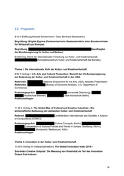 2.2 Programm 9:10 h Eröffnung Michael Söndermann / Gesa Birnkraut (Moderation) Begrüßung: Brigitte Zypries (Parlamentarische Staatssekretärin beim Bundesminister für Wirtschaft und Energie) Begrüßung: Beauftragten der Bundesregierung für Kultur und Medien) Einführung: Stand der internationalen Forschung zur Kultur- und Kreativwirtschaft, (Kompetenzzentrum Kultur- und Kreativwirtschaft des Bundes), Thema I: Die internationale Sicht der Kultur- und Kreativwirtschaft 9:50 h Vortrag I: U.S. Arts and Cultural Production / Bericht der US-Bundesregierung zur Bedeutung der Kultur- und Kreativwirtschaft in den USA Referentin: (National Endowment for the Arts, USA), Abstrakt, Präsentation Referentin: (Bureau of Economic Analysis, U.S. Department of Commerce) Podiumsgespräch: (Universität Oldenburg), (Hochschule Bremen), (bbw hochschule Berlin) Publikumsfragen 11:20 h Vortrag II: The Global Map of Cultural and Creative Industries / Die wirtschaftliche Bedeutung der weltweiten Kultur- und Kreativwirtschaft Referent: Confédération Internationale des Sociétés d´Auteurs et Compositeurs (CISAC)) Podiumsgespräch: (Culture Concepts, Berlin), (Compendium of Cultural Policies and Trends in Europe, Straßburg / Bonn), (Komponist, Mediamusic, Köln) Publikumsfragen Thema II: Innovation in der Kultur- und Kreativwirtschaft 13:45 h Vortrag III (Videopräsentation): The Global Innovation Index 2016 – Sub-Index Creative Outputs / Die Messung von Kreativität als Teil des Innovation Output Sub-Indexes 14