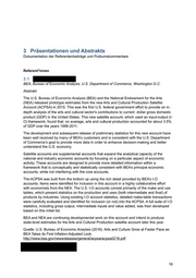 3 Präsentationen und Abstrakts Dokumentation der Referentenbeiträge und Podiumskommentare Referent*innen 3.1 BEA, Bureau of Economic Analysis, U.S. Department of Commerce, Washington D.C. Abstrakt The U.S. Bureau of Economic Analysis (BEA) and the National Endowment for the Arts (NEA) released prototype estimates from the new Arts and Cultural Production Satellite Account (ACPSA) in 2015. This was the first U.S. federal government effort to provide an in‐ depth analysis of the arts and cultural sector's contributions to current‐dollar gross domestic product (GDP) in the United States. This new satellite account, which used an input-output (I- O) framework, found that, on average, arts and cultural production accounted for about 3.5% of GDP over the years 1998-2011. The development and subsequent release of preliminary statistics for this new account have been well received by many of BEA’s customers and is consistent with the U.S. Department of Commerce’s goal to provide more data in order to enhance decision-making and better understand the U.S. economy. Satellite accounts are supplemental accounts that expand the analytical capacity of the national and industry economic accounts by focusing on a particular aspect of economic activity. These accounts are designed to provide more detailed information within a framework that is conceptually and statistically consistent with BEA’s principal economic accounts, while not interfering with the core accounts. The ACPSA was built from the bottom up using the rich detail provided by BEA’s I-O accounts. Items were identified for inclusion in this account in a highly collaborative effort with economists from the NEA. The U.S. I-O accounts consist primarily of the make and use tables, which present statistics on the production and uses (both intermediate and final) of products by industries. Using existing I-O account statistics, detailed make-table transactions were carefully evaluated and identified for inclusion (or not) into the ACPSA. A full suite of I-O statistics, including gross output, intermediate inputs and value added, was then developed based on this initial list. BEA and NEA are continuing developmental work on this account and intend to produce state-level estimates for the Arts and Cultural Production satellite account later this year. Quelle: U.S. Bureau of Economic Anaylsis (2016). Arts and Culture Grow at Faster Pace as BEA Takes its First Inflation-Adjusted Look. http://www.bea.gov/newsreleases/general/acpsa/acpsa0216.pdf 16