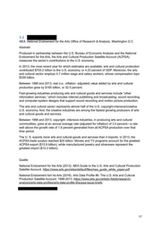 3.2 NEA, National Endowment for the Arts Office of Research & Analysis, Washington D.C. Abstrakt Produced in partnership between the U.S. Bureau of Economic Analysis and the National Endowment for the Arts, the Arts and Cultural Production Satellite Account (ACPSA) measures the sector’s contributions to the U.S. economy. In 2013, the most recent year for which estimates are available, arts and cultural production contributed $704.2 billion to the U.S. economy, or 4.23 percent of GDP. Moreover, the arts and cultural sector employs 4.7 million wage and salary workers, whose compensation tops $339 billion. Between 1998 and 2013, real (i.e., inflation‐adjusted) value added by arts and cultural production grew by $165 billion, or 32.5 percent. Fast-growing industries producing arts and cultural goods and services include “other information services,” which includes Internet publishing and broadcasting; sound recording; and computer-system designs that support sound recording and motion picture production. The arts and cultural sector represents almost half of the U.S. copyright-intensive/creative U.S. economy. And, the creative industries are among the fastest growing producers of arts and cultural goods and services. Between 1998 and 2013, copyright‐intensive industries, in producing arts and cultural commodities, grew at an annual average rate (adjusted for inflation) of 3.5 percent—a rate well above the growth rate of 1.8 percent generated from all ACPSA production over that time period. The U. S. exports more arts and cultural goods and services than it imports. In 2013, the ACPSA trade surplus reached $24 billion. Movies and TV programs account for the greatest ACPSA export ($15.9 billion), while manufactured jewelry and silverware represent the greatest import ($12.2 billion). Quelle: National Endowment for the Arts (2013). NEA Guide to the U.S. Arts and Cultural Production Satellite Account. https://www.arts.gov/sites/default/files/nea_guide_white_paper.pdf National Endowment fort he Arts (2016). Arts Data Profile #9. The U.S. Arts and Cultural Production Satellite Account: 1998-2013. https://www.arts.gov/artistic-fields/research- analysis/arts-data-profiles/arts-data-profile-9/acpsa-issue-briefs 17