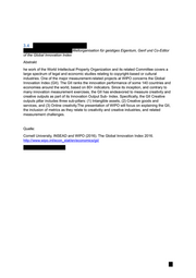 3.4 Weltorganisation für geistiges Eigentum, Genf und Co-Editor of the Global Innovation Index Abstrakt he work of the World Intellectual Property Organization and its related Committee covers a large spectrum of legal and economic studies relating to copyright-based or cultural industries. One of the major measurement-related projects at WIPO concerns the Global Innovation Index (GII). The GII ranks the innovation performance of some 140 countries and economies around the world, based on 80+ indicators. Since its inception, and contrary to many innovation measurement exercises, the GII has endeavored to measure creativity and creative outputs as part of its Innovation Output Sub- Index. Specifically, the GII Creative outputs pillar includes three sub-pillars: (1) Intangible assets, (2) Creative goods and services, and (3) Online creativity.The presentation of WIPO will focus on explaining the GII, the inclusion of metrics as they relate to creativitiy and creative industries, and related measurement challenges. Quelle: Cornell University, INSEAD and WIPO (2016). The Global Innovation Index 2016. http://www.wipo.int/econ_stat/en/economics/gii/
