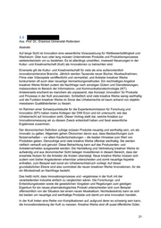 3.5 Ass. Prof. Dr., Erasmus Universität Rotterdam Abstrakt Auf lange Sicht ist Innovation eine wesentliche Voraussetzung für Wettbewerbsfähigkeit und Wachstum: Über kurz oder lang müssen Unternehmen Produkte und Produktionsprozesse weiterentwickeln um zu bestehen. Es ist allerdings umstritten, inwieweit Neuerungen in der Kultur- und Kreativwirtschaft (KuK) als Innovationen zu betrachten sind. Einerseits gilt die Kultur- und Kreativwirtschaft für viele als eine außerordentlich innovationsintensive Branche. Jährlich werden Tausende neuer Bücher, Musikaufnahmen, Filme oder Videospiele veröffentlicht und vermarktet, und Anbieter kreativer Werke konkurrieren oft auch über neuartige Vermarktungsmethoden. Ein reichhaltiges Angebot kreativer Werke fördert zudem die Nachfrage nach sonstigen Gütern und Dienstleistungen, insbesondere im Bereich der Informations- und Kommunikationstechnologie (IKT). Andererseits erscheint es manchem als unpassend, das Konzept ‚Innovation’ für Produkte und Prozesse in der KuK anzuwenden. Schließlich sind viele kreative Werke wenig werthaltig und die Funktion kreativer Werke im Sinne des Urheberrechts ist kaum anhand von objektiv messbaren Qualitätskriterien zu fassen. Im Rahmen einer Schwerpunktstudie für die Expertenkommission für Forschung und Innovation (EFI) haben meine Kollegen der DIW Econ und ich untersucht, wie das Urheberrecht auf Innovation wirkt. Dieser Vortrag stellt dar, welche Ansätze zur Innovationsmessung wir zu diesem Zweck entwickelt haben und fasst wesentliche Ergebnisse zusammen. Der ökonomischen Definition zufolge müssen Produkte neuartig und werthaltig sein, um als innovativ zu gelten. Allgemein gehen Ökonomen davon aus, dass Beobachtungen zum Nutzerverhalten – vor allem Kaufentscheidungen – die besten Hinweise zum Wert von Produkten geben. Demzufolge sind viele kreative Werke offenbar werthaltig: Sie werden vielfach verkauft und genutzt. Diese Betrachtung kann auf das Produzenten- und Anbieterverhalten ausgeweitet werden: Die Herstellung und Verbreitung kreativer Werke ist aufwändig und aus ökonomischer Sicht belegen Investitionen in diesem Bereich, dass der erwartete Nutzen für die Anbieter die Kosten übersteigt. Neue kreative Werke müssen sich zudem vom bisher Angebotenen erkennbar unterscheiden und somit neuartige Aspekte enthalten, zum Beispiel weil sonst ein Urheberrechtsbruch vorliegt. Auf dieser grundsätzlichen Ebene sind also zumindest die neuen kreativen Werke Innovationen, für die ein Mindestmaß an Nachfrage besteht. Das heißt nicht, dass Innovationsprozesse und –ergebnisse in der KuK mit der verarbeitenden Industrie einfach zu vergleichen wären. Die Forschungs- und Entwicklungskosten sowie die gesetzlichen Vorgaben und Regelungen zum geistigen Eigentum für ein neues pharmakologisches Produkt unterscheiden sich zum Beispiel offensichtlich von der Situation bei einem neuen Musikalbum. Nichtsdestotrotz kann es sich bei beiden um neuartige und werthaltige Produkte und damit um eine Innovation handeln. In der KuK treten eine Reihe von Komplikationen auf, aufgrund derer es schwierig sein kann, die Innovationsleistung der KuK zu messen. Kreative Werke sind oft quasi-öffentliche Güter, 21