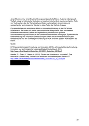 deren Marktwert nur einen Bruchteil ihres gesamtgesellschaftlichen Nutzens widerspiegelt. Vielfach belegt ist intrinsische Motivation zu kreativer Arbeit und die zunehmend aktive Rolle von Verbrauchern bei der Wertschöpfung. Zudem verkompliziert ein schneller und weitreichender technologischer Wandel in vielen Teilen der KuK die Analyse. Ein wesentliches und umstrittenes Mittel zur Innovationsförderung in der KuK ist das Urheberrecht. Es finden sich bisher kaum empirische Belege dafür, dass ein stärkerer Urheberrechtsschutz im Kontext der Digitalisierung tatsächlich mit größerer Innovationsleistung und Effizienz in den Urheberrechtsbranchen einherginge. Systematische Datenerhebung und empirische Untersuchungen sollten bei der Weiterentwicklung des Urheberrechts und der nachhaltigen Förderung der KuK eine weit größere Rolle spielen als bisher. Quelle: EFI/Expertenkommission Forschung und Innovation (2015). Jahresgutachten zu Forschung, Innovation und technologischer Leistungsfähigkeit Deutschlands 2015. http://www.e-fi.de/fileadmin/Gutachten_2015/EFI_Gutachten_2015.pdf Handke, C.; Girard, Y.; Mattes, A. (2015). Fördert das Urheberrecht Innovation? Eine empirische Untersuchung, Studien zum deutschen Innovationssystem, Berlin: EFI. http://www.e-fi.de/fileadmin/Innovationsstudien_2015/StuDIS_16_2015.pdf 22