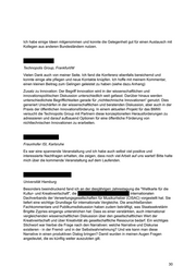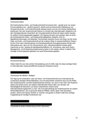 Hochschule Mainz Die Fachkonferenz Kultur- und Kreativwirtschaft hat einmal mehr - gerade auch von einem Forschungsfokus aus - deutlich gemacht, welche enorme ökonomische Bedeutung und Dynamik die Kultur- und Kreativwirtschaft weltweit besitzt und wie sich hierbei Deutschland positioniert. Der sehr anspruchsvolle Diskurs im Kontext des internationalen Vergleichs und den Interdependenzen hinsichtlich der Innovationskraft der Branche haben starke Impulse für weitere Forschungsaspekte gegeben. Die Tagung hat aber auch gezeigt, dass es durch die Komplexität des Kultur- und Kreativwirtschaftssektors weiterhin noch zu Begriffsvermischungen und fehlender Trennschärfe zwischen Kunst und Kultur auf der einen Seite und Kultur- und Kreativwirtschaft auf der anderen Seite im wissenschaftlichen Diskurs kommt. Eine mehr interdisziplinäre und fachübergreifende Herangehensweise könnte sehr befruchtend sein, denn ein rein ökonomischer bzw. volkswirtschaftlicher Ansatz greift manchmal zu kurz. Gerade die betriebswirtschaftliche z.B. Innovations- aber auch Kultur-, Management- und Entrepreneurshipforschung haben in den letzten Jahren in diesem Feld wichtige Forschungsarbeit geleistet und neue Erkenntnisse geliefert. Hochschule Bremen Vielen Dank! Es war eine schöne Veranstaltung und ich hoffe, dass Du diese wichtige Arbeit im internationalen wissenschaftlichen Austausch fortsetzen kannst. Hochschule der Medien, Stuttgart Die Tagung hat verdeutlicht, dass die Kultur- und Kreativwirtschaft auch international als zunehmend wichtiger Wirtschaftssektor und Innovationtreiber anerkannt wird und die Politik den Kreativbranchen vermehrt Aufmerksamkeit schenkt, nun auch in den USA. Die Kreativen selbst sind bereits schon auf vielfach internationaler Ebene aktiv und vernetzt, die Kleinteiligkeit der Branchen und deren Unternehmen scheint keine Internationalisierungsbarriere zu sein. Der Innovationsbeitrag der Kreativbranchen für andere Wirtschaftssektoren, die so genannte Spillover-Effekte, dürfen dabei nicht übersehen werden. Diese noch besser sichtbar zu machen und gezielt zu fördern stellt eine wichtige Fragestellung für künftige Konferenzen dar. Popakademie Baden-Württemberg GmbH, Mannheim 31
