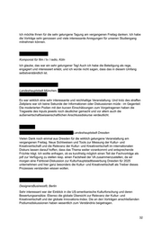 Ich möchte Ihnen für die sehr gelungene Tagung am vergangenen Freitag danken. Ich habe die Vorträge sehr genossen und viele interessante Anregungen für unseren Studiengang mitnehmen können. Komponist für film / tv / radio, Köln Ich glaube, das war ein sehr gelungener Tag! Auch ich habe die Beteiligung als rege, engagiert und interessiert erlebt, und ich würde nicht sagen, dass das in diesem Umfang selbstverständlich ist. Landeshauptstadt München, Es war wirklich eine sehr interessante und reichhaltige Veranstaltung. Und trotz des straffen Zeitplans war ich keine Sekunde der Informationen oder Diskussionen müde - im Gegenteil: Die moderierten Podien mit den kurzen Einschätzungen zum Vorgetragenen haben die Tragweite des Inputs jeweils noch deutlicher gemacht und vor allem auch die außenwirtschaftswissenschaftlichen Anschlussdiskurse verdeutlicht. Landeshauptstadt Dresden Vielen Dank noch einmal aus Dresden für die wirklich gelungene Veranstaltung am vergangenen Freitag. Neue Sichtweisen und Tools zur Messung der Kultur- und Kreativwirtschaft und die Relevanz der Kultur- und Kreativwirtschaft im internationalen Diskurs lassen darauf hoffen, dass das Thema weiter vorankommt und entsprechende Früchte trägt. Ich wollte anfragen, ob es kurzfristig möglich einen Teil der Fachvorträge als pdf zur Verfügung zu stellen resp. einen Factsheet der VA zusammenzustellen, da wir morgen eine Fishbowl-Diskussion zur Kulturhauptstadtbewerbung Dresden für 2025 unternehmen und hier ganz besonders die Kultur- und Kreativwirtschaft als Treiber dieses Prozesses verstanden wissen wollen. DesignersBusiness®, Berlin Sehr interessant war der Einblick in die US-amerikanische Kulturforschung und deren Bewertungsansätze. Ebenso die globale Übersicht zur Relevanz der Kultur- und Kreativwirtschaft und der globale Innovations-Index. Die an den Vorträgen anschließenden Podiumsdiskussionen haben wesentlich zum Verständnis beigetragen. 32