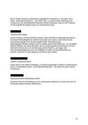 Das im letzten Vortrag am Nachmittag vorgestellte EFI-Gutachten zur Innovation durch Kultur- und Kreativwirtschaft ist – aus meiner Sicht – ein guter Ansatz. Allerdings ist im Vortrag und in der anschließenden Diskussion deutlich geworden, dass es noch Probleme mit den begrifflichen Abgrenzungen und Interpretationen gibt. CultureConsult Leipzig Auf der Konferenz wurde eindrücklich deutlich, dass die Branche mittlerweile international eine feste Wirtschaftsgröße ist. Deutlich wurde aber auch, dass es weit mehr als reine ökonomische Aspekte sind, die dazu geführt haben. Die Messung des gesamtgesellschaftlichen Nutzens wird die nächste große Herausforderung - von monetären Spillover-Effekten auf andere Branchen, dem Innovationsgehalt auf technischer und nicht- technischer Ebene aber auch der Messung weicher Faktoren, wie Image- oder Lebensqualitätssteigerung, durch die vielfältigen Produkte und Dienstleistungen der Branche. Darauf bin ich sehr gespannt und komme gerne wieder. Initiative Urheberrecht Berlin Vielen Dank für die äußerst vielseitigen und absolut notwendigen Vorträge und Diskussionen bei der „Fachkonferenz Kultur- und Kreativwirtschaft 2016“ – wir freuen uns schon auf die Fortsetzung! Medienboard Berlin-Brandenburg GmbH Herzlichen Dank für die Einladung zu der interessanten Konferenz! Ich würde mich sehr für die Konferenzdokumentation interessieren. 33