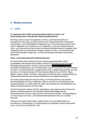 5 Medienresonanz 5.1 GEMA 27. September 2016, CISAC präsentiert globale Studie zur Kultur- und Kreativwirtschaft auf internationaler Wissenschaftskonferenz Die Frage, welche neueren Konzeptionen zur Kultur- und Kreativwirtschaft es im internationalen Raum gibt und welche Erkenntnis die Fachgemeinschaft in Deutschland insbesondere zu den Schlüsselthemen Digitalisierung und Innovation daraus ziehen kann, stand im Mittelpunkt einer Konferenz am 23. September, zu der das Kompetenzzentrum Kultur- und Kreativwirtschaft des Bundes ins Bundeswirtschaftsministerium eingeladen hatte. Vorgestellt wurden die international wichtigsten Studien zur Kultur- und Kreativwirtschaft, welche Wissenschaftler, Regierungs- und Branchenvertreter anschließend gemeinsam diskutierten. Kultur- und Kreativwirtschaft als Wachstumsmotor Der internationale Dachverband der Autoren-Verwertungsgesellschaften CISAC (Confédération Internationale des Sociétés d’Auteurs et Compositeurs) war als einzige Nichtregierungsorganisation mit einem Vortrag vertreten. präsentierte die gemeinsam mit EY erstellte Studie Cultural Times (2015), die erste Weltkarte zur Kultur- und Kreativwirtschaft. In geographische Zonen unterteilt zeigt die Studie auf, dass die Kultur- und Kreativwirtindustrie mit ihren Sektoren Bildende Kunst, AV/Film, Presse, Medien, Literatur, Design, Architektur, Videospiele und Werbung einen massiven Beitrag zur Weltwirtschaft leistet und eine zentrale Antriebskraft für die digitale Wirtschaft ist: Der Studie zufolge beträgt der Anteil der Kultur- und Kreativindustrie an der globalen Wirtschaftstätigkeit drei Prozent (2250 Mrd. US$) im Jahr 2014 und übersteigt damit das Bruttoinlandprodukt von Indien (1900 Mrd. US$). Das entspricht dem anderthalbfachen der Telekommunikationsdienste (1570 Mrd US$). Die Branche generiert weltweit 29,5 Mio. Arbeitsplätze. Dies entspricht einem Prozent der globalen Erwerbsbevölkerung und übertrifft die Gesamt-Beschäftigtenzahl der Automobilindustrie in Europa, Japan und den USA zusammen (25 Mio.). Die Beschäftigung von Frauen liegt in der Kultur- und Kreativwirtschaft tendenziell höher als in anderen Branchen. Kulturelle und kreative Inhalte fördern darüber hinaus neue Geschäftsmodelle und Innovationen im Online-Bereich. Ihr direkter Beitrag zum weltweiten Internet-Handel belief sich im Jahr 2013 auf fast 200 Mrd. US$. 34