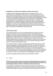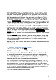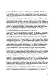 establish a level playing field.” The conversation in Germany had overlooked the value of CCIs, yet this trend has reversed with a newfound economic focus on these industries in recent years. Andreas Johannes Wiesand of Cultural Compendium continued discussing protection of creators. He stated, “There is an unequal situation in regards to employees in these various areas of cultural industries. What we can learn from this is that the share of employees in precarious job situations is much higher as compared to the rest of society. This should be reason for us to work harder and to deal with this to find solutions.” Finally, composer brought up disruption in the industries, confirming that “Value is created but not fed back. We have to urgently act and create a regulatory framework. We need to develop legal tools and instruments that go across boundaries.” The presentation and panel discussion concluded with a Q&A session. During the session, several comments surrounded the surprise of learning that Asia-Pacific was measured as larger than Europe in size. In recent years, China had changed their approach to copyright protection after learning that the country has a local interest. reinforced China’s call to reinforce and protect domestic-produced creation. echoed this, saying the “rethinking” process had taken place in the United States in the past. Concluding, provided attendees in Berlin with one key takeaway, “You see what supportive government legislation can do for the economics of cultural industries. When the government decides to support these industries, there are rewards not only in terms of culture, but also economic.” Read the “Cultural Times – The First Global Map of Cultural and Creative Industries” study at worldcreative.org. 5.3 Initiative Kultur- und Kreativwirtschaft (kultur-kreativ-wirtschaft.de, Text PID/ ) 26.9.2016, Internationale Konferenz zur Kultur- und Kreativwirtschaft Welche Konzepte zur Kultur- und Kreativwirtschaft gibt es aktuell auf internationaler Ebene und welche Erkenntnisse kann die Fachgemeinschaft in Deutschland daraus gewinnen? Welche Ansätze bieten sich, um die eigenständige Innovationsrolle des Wirtschaftszweiges zu verdeutlichen? Und: Ist es möglich, im Rahmen kreativer Produktionsprozesse innovativ zu sein oder bleibt dies allein Technologieunternehmen überlassen? Diese Fragen standen bei einer internationalen Fachkonferenz im Mittelpunkt, zu der das Kompetenzzentrum der Initiative Kultur- und Kreativwirtschaft der Bundesregierung am 23. September geladen hatte. Im Rahmen der Veranstaltung tauschten sich Angehörige von Regierungsorganisationen, Wissenschaftler und Branchenvertreter rund um den Status Quo und die Chancen der "Creative Industries" im 21. Jahrhundert aus. Die Konferenz fand im Bundesministerium für Wirtschaft und Energie in Berlin statt. Kultur- und Kreativwirtschaft als Wachstumsmotor 37