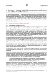 3 Innovation – Konzepte, Begriffsdifferenzierungen und eine Definition von nichttechnischen Innovationen Im folgenden Kapitel zeigen wir – ausgehend von zentralen Definitionen des Innovationsbegriffs – auf, wie sich der Innovationsbegriff in einer breiten, auf nichttechnische Aspekte erweiterten Perspek- tive verstehen lässt. Dabei stellen wir sowohl Erkenntnisse aus der Literaturanalyse sowie aus Inter- views mit Praktikern dar. Anschließend erarbeiten wir Möglichkeiten der Differenzierung verschiede- ner Innovationsarten. Als Ergebnis stellen wir die in diesem Projekt erarbeitete Definition von nicht- technischen Innovationen vor und erläutern diese anhand verschiedener Ausprägungen von nicht- technischen Innovationen. 3.1 Zentrale Definitionen des Begriffs „Innovation“ 3.1.1 Innovation im Verständnis der OECD In der innovationspolitischen Praxis, der Analyse und Messung von Innovationstätigkeit und der sich daraus ergebenden Förderpolitik werden insbesondere das Oslo-Manual (OECD, 2005) sowie das Frascati-Manual (OECD , 2015) als Grundlagen herangezogen, um Innovationen in ihren vielfältigen Formen identifizieren, messen und bewerten zu können. Diese beiden Dokumente bilden für Ent- scheidungsträger in Förderinstitutionen eine wichtige Grundlage, um die Entscheidungen für eine entsprechende Innovationspolitik und -förderung zu treffen. Auf diese wird etwa auch im Unionsrah- men für staatliche Beihilfen zur Förderung von Forschung, Entwicklung und Innovation bzw. im des- sen Vorgängerdokument, dem Gemeinschaftsrahmen für staatliche Beihilfen zur Förderung von For- schung, Entwicklung und Innovation von 2006, Bezug genommen. Die zentralen Argumentationslinien des Oslo-Manuals stehen für ein Innovationsverständnis, das sowohl hinsichtlich der aktuellen Innovationsdynamiken in der Gesellschaft als auch bezogen auf den aktuellen Stand der wissenschaftlichen Reflexion bewertet werden muss. Insbesondere wenn sich für die Innovationspolitik die Frage nach einer verbesserten Förderung nichttechnischer Innovationen stellt, bedarf es sowohl eines erweiterten Verständnisses von Innovation als ein ubiquitäres Phänomen der Gesellschaft (vgl. Braun-Thürmann 2005) als auch der vielfältigen Formen, in denen Innovationen in der Gesellschaft realisiert werden (vgl. Rammert 2014). Um dies zu leisten, werden im Folgenden in einem ersten Schritt die zentralen Aspekte des Innnovationsverständnisses des Frascati- und vor allem des Oslo-Manuals herausgearbeitet. In einem zweiten Schritt werden sie einer kritischen Betrachtung unterzogen, um zu verdeutlichen, welche Anpassungen im Hinblick auf eine verstärkte Förderung nichttechnischer Innovationen not- wendig sind. Das Kernziel des Frascati Manuals ist die statistische Erfassung von Innovationsprozessen anhand von FuE-Aktivitäten. Innovationen werden also im Frascati Manual als direktes Ergebnis eines FuE- Prozesses verstanden. Die verschiedenen Auflagen des Frascati-Manuals liefern die konzeptionelle Grundlage zur Messung und zum Vergleich von FuE-Aktivitäten und damit einhergehenden Innovati- onsdynamiken in Volkswirtschaften. Das Frascati Manual definiert FuE wiederholt als „(...) creative and systematic work undertaken in order to increase the stock of knowledge – including knowledge of humankind, culture and society – and to devise new applications of available knowledge” (OECD, Frascati Manual 2005, S. 30 und 2015, S. 44) Mit Blick auf nichttechnische Innovationen ist zunächst folgende Problematik festzuhalten: Das Fra- scati-Manual legt bei seiner Definition von FuE implizit den Fokus auf technologische FuE-Prozesse. Die Konzentration auf FuE-Tätigkeiten und Aufwendungen als Basis für Innovationen (Grundlagen- und angewandte Forschung sowie experimentelle Arbeiten (vgl. OECD 2015: 60ff.)) werden jedoch der tatsächlichen Ausprägungsvielfalt des Innovationsgeschehens nicht gerecht, da gerade nichttechnische Ökonomische und verwaltungs-technische Grundlagen einer möglichen öffentlichen Förderung von 16 nichttechnischen Innovationen