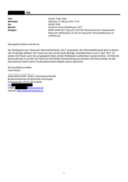 , VIA Von: Fischer, Frank, VIA5 Gesendet: Dienstag, 14. Februar 2017 17:24 An: BUERO-VIA5 Betreff: Deutscher Wirtschaftsfilmpreis 2017 Anlagen: BMWi-WifiPr2017-Flyer.pdf; 0214 PM Parlamentarischer Staatssekretär Wiese Der Wettbewerb um den 50. Deutschen Wirtschaftsfilmpreis ist eröffnet!.pdf Sehr geehrte Damen und Herren, der Wettbewerb zum "Deutschen Wirtschaftsfilmpreis 2017" ist gestartet. Der Wirtschaftsfilmpreis feiert in diesem Jahr 50-jähriges Jubiläum! Wir freuen uns sehr auf die neuen Beiträge. Anmeldeschluss ist am 2. April 2017. Ich würde mich freuen, wenn Sie auf geeignete Weise auf den Wettbewerb aufmerksam machen könnten. Ich bitte Sie bereits jetzt den 4. Juli 2017 als Termin für die festliche Preisverleihung vorzumerken. Die Preise werden im Kino International in Berlin durch Frau Bundesministerin Brigitte Zypries überreicht. Mit freundlichen Grüßen Frank Fischer _______________________ Leiter Referat VIA5 - Kultur- und Kreativwirtschaft Bundesministerium für Wirtschaft und Energie Scharnhorststr. 34-37, 10115 Berlin Tel: E-Mail: @bmwi.bund.de Internet: http://www.bmwi.bund.de 1