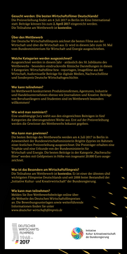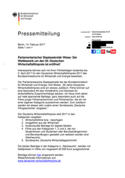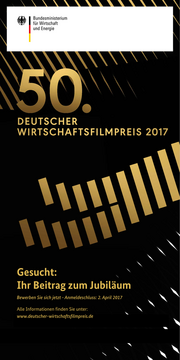 Gesucht werden: Die besten Wirtschaftsfilmer Deutschlands! Die Preisverleihung findet am 4. Juli 2017 in Berlin im Kino International statt. Beiträge können bis zum 2. April 2017 eingereicht werden. Die Teilnahme am Wettbewerb ist kostenlos. Über den Wettbewerb Der Deutsche Wirtschaftsfilmpreis zeichnet die besten Filme aus der Wirtschaft und über die Wirtschaft aus. Er wird in diesem Jahr zum 50. Mal vom Bundesministerium für Wirtschaft und Energie ausgeschrieben. Welche Kategorien werden ausgezeichnet? Ausgezeichnet werden in diesem Jahr - anlässlich des 50. Jubiläums des Wettbewerbs - besonders eindrucksvolle filmische Darstellungen in diesen 5 Kategorien: Wirtschaftsfilme bzw. -reportagen, Imagefilme aus der Wirtschaft, Audiovisuelle Beiträge für digitale Medien, Nachwuchsfilme und Sonderpreis Deutsche Wirtschaftsgeschichte. Wer kann teilnehmen? Im Wettbewerb konkurrieren Produktionsfirmen, Agenturen, Industrie und Handelsunternehmen ebenso wie Journalisten und Kreative. Beiträge von Berufsanfängern und Studenten sind im Wettbewerb besonders willkommen! Wie wird man nominiert? Eine unabhängige Jury wählt aus den eingereichten Beiträgen in fünf Kategorien die überzeugendsten Werke aus. Erst auf der Preisverleihung werden die Gewinner des Wettbewerbs bekannt gegeben. Was kann man gewinnen? Die besten Beiträge des Wettbewerbs werden am 4. Juli 2017 in Berlin in Anwesenheit der Bundeswirtschaftsministerin Brigitte Zypries im Rahmen einer festlichen Preisverleihung ausgezeichnet. Die Preisträger erhalten eine Trophäe und eine Urkunde von der Bundesministerin für Wirtschaft und Energie. Die besten Beiträge in der Kategorie „Nachwuchs- filme“ werden mit Geldpreisen in Höhe von insgesamt 20.000 Euro ausge- zeichnet. Was ist das Besondere am Wirtschaftsfilmpreis? Die Teilnahme am Wettbewerb ist kostenlos. Er ist einer der ältesten und wichtigsten Filmpreise Deutschlands und seit 2008 fester Bestandteil der „Initiative Kultur- und Kreativwirtschaft“ der Bundesregierung. Wie kann man teilnehmen? Melden Sie Ihre Wettbewerbsbeiträge online über die Webseite des Deutschen Wirtschaftsfilmpreises an. Die Bewerbungsunterlagen sowie weiterführende Informationen finden Sie unter www.deutscher-wirtschaftsfilmpreis.de