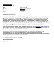 , VIB Von: Fischer, Frank, VIA5 Gesendet: Mittwoch, 14. Juni 2017 14:06 An: @t-online.de Betreff: IFG-Anfrage Sehr geehrter Herr Prof. Gorny, wir hatten Sie am 17.5.2017 über die kürzlich im BMWi eingegangen Anfrage nach dem Informationsfreiheitsgesetz, gerichtet auf "sämtliche ein- und ausgegangen E-Mails aus 2016 und 2017 vom Kreativbeauftragten Dieter Gorny" informiert. Nach dem IFG sind natürliche Personen, denen sich eine Behörde zur Erfüllung öffentlich-rechtlicher Aufgaben bedient, wie Behörden informationsverpflichtet; der Antrag ist dabei an die Behörde zu richten (§ 1 Abs. 1 Satz 3 , § 7 Abs. 1 Satz 1 IFG). Nach eingehender Prüfung sind wir gemeinsam mit unserem zentralen Rechtsreferat zu dem Ergebnis gekommen, dass Sie in Ihrer Eigenschaft als Beauftragter für Kreative und Digitale Ökonomie aufgrund der Ihnen durch Vertrag zugewiesenen Aufgaben nach § 1 Abs. 1 Satz 3 IFG informationsverpflichtet sind. Daher sind wir nach dem IFG gehalten, Sie um Herausgabe sämtlicher ein- und ausgegangener E-Mails aus 2016 und 2017 von Ihrem E-Mailkonto als Beauftragter für Kreative und Digitale Ökonomie ( @t-online.de) bis zum 20. Juni 2017 zu bitten. Die kurze Frist bitte ich zu entschuldigen. Gemeinsam mit unserem zentralen Rechtsreferat werden wir die E-Mails noch daraufhin prüfen, ob ggf. Ausnahmegründe nach dem IFG (z.B. nicht abgeschlossene Beratungsprozesse oder Betriebs- und Geschäftsgeheimnisse) einer Herausgabe an den Antragssteller entgegenstehen. Der Antragssteller hat sich mit einer Schwärzung personenbezogener Daten einverstanden erklärt. Für Rückfragen stehen wir gerne zur Verfügung. Mit freundlichen Grüßen Frank Fischer 1