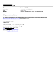 , VIB Von: Fischer, Frank, VIA5 Gesendet: Mittwoch, 14. Juni 2017 16:52 An: BUERO-VIA5 Betreff: Relaunch Website Initiative Kultur- und Kreativwirtschaft Sehr geehrte Damen und Herren, ab heute ist die neue Website der Initiative Kultur- und Kreativwirtschaft der Bundesregierung online unter http://www.kultur-kreativ-wirtschaft.de. Viel Spaß beim Lesen! Mit freundlichen Grüßen Frank Fischer __________________________ Leiter Referat VIA5 - Kultur- und Kreativwirtschaft Bundesministerium für Wirtschaft und Energie Scharnhorststr. 34-37, 10115 Berlin Tel: E-Mail: @bmwi.bund.de Internet: http://www.bmwi.bund.de 1