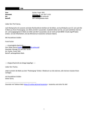 , VIB Von: Fischer, Frank, VIA5 Gesendet: Dienstag, 20. Juni 2017 13:26 An: @t-online.de Betreff: AW: weitergeleitete Mails Lieber Herr Prof. Gorny, nach Rücksprache mit unserem zentralen Rechtsreferat möchten wir Sie bitten, uns kurzfristig bis zum 22. Juni auch die E-Mails aus Ihrem Postausgang von 2016 und 2017 zuzusenden. Zusätzlich bitten wir Sie, uns auch sämtliche internen ein- und ausgegangenen E-Mails von 2016 und 2017 zuzusenden, da wir nicht auf alle BMWi- Emails Zugriff haben (insbes. von den Mitarbeitern, die das Ministerium inzwischen verlassen haben). Mit freundlichen Grüßen Frank Fischer -----Ursprüngliche Nachricht----- Von: Dieter Gorny [mailto: @t-online.de] Gesendet: Montag, 19. Juni 2017 16:28 An: Fischer, Frank, VIA5 Betreff: weitergeleitete Mails -----Original-Nachricht als Anlage beigefügt ----- Lieber Herr Fischer, anbei nunmehr die Mails aus dem "Posteingang"-Ordner. Wiederum nur die externen, alle internen müssten Ihnen vorliegen. mit freundlichen Grüßen Dieter Gorny ---------------------------------------------------------------- Gesendet mit Telekom Mail <https://t-online.de/email-kostenlos> - kostenlos und sicher für alle! 1