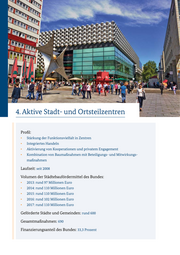 4. Aktive Stadt- und Ortsteilzentren Profil: ∙∙ Stärkung der Funktionsvielfalt in Zentren ∙∙ Integriertes Handeln ∙∙ Aktivierung von Kooperationen und privatem Engagement ∙∙ Kombination von Baumaßnahmen mit Beteiligungs- und Mitwirkungs maßnahmen Laufzeit: seit 2008 Volumen der Städtebaufördermittel des Bundes: ∙∙ 2013: rund 97 Millionen Euro ∙∙ 2014: rund 110 Millionen Euro ∙∙ 2015: rund 110 Millionen Euro ∙∙ 2016: rund 102 Millionen Euro ∙∙ 2017: rund 110 Millionen Euro Geförderte Städte und Gemeinden: rund 600 Gesamtmaßnahmen: 690 Finanzierungsanteil des Bundes: 33,3 Prozent