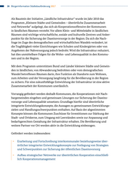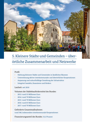 5. Kleinere Städte und Gemeinden – über örtliche Zusammenarbeit und Netzwerke Profil: ∙∙ Stärkung kleinerer Städte und Gemeinden in ländlichen Räumen ∙∙ Unterstützung aktiver interkommunaler und überörtlicher Kooperationen ∙∙ Anpassung und zukunftsfähige Gestaltung der Infrastruktur ∙∙ Integriert handeln, finanzieren und fördern Laufzeit: seit 2010 Volumen der Städtebaufördermittel des Bundes: ∙∙ 2013: rund 55 Millionen Euro ∙∙ 2014: rund 70 Millionen Euro ∙∙ 2015: rund 70 Millionen Euro ∙∙ 2016: rund 65 Millionen Euro ∙∙ 2017: rund 70 Millionen Euro Geförderte Gesamtmaßnahmen: rund 540, insbesondere interkommunale Kooperationen Finanzierungsanteil des Bundes: 33,3 Prozent