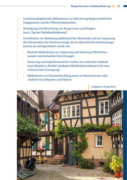Bürgerinformation Städtebauförderung 2017 27 ∙∙ Investitionsbegleitende Maßnahmen zur Aktivierung bürgerschaftlichen Engagements und der Öffentlichkeitsarbeit ∙∙ Beteiligung und Mitwirkung von Bürgerinnen und Bürgern (auch „Tag der Städtebauförderung“) ∙∙ Investitionen zur Behebung städtebaulicher Missstände und zur Anpassung der Infrastruktur der Daseinsvorsorge, die im überörtlichen Abstimmungs- prozess als wichtig erkannt wurde, wie ∙∙ Bauliche Maßnahmen zur Anpassung und Sanierung öffentlicher, sozialer und kultureller Einrichtungen ∙∙ Sanierung und bedarfsorientierter Umbau leer stehender Gebäude (zum Beispiel zu flexibel nutzbaren Multifunktionshäusern für eine wohnortnahe Versorgung) ∙∙ Maßnahmen zur Innenentwicklung sowie zur Barrierearmut oder -freiheit von Gebäuden und Flächen Engelgasse, Gengenbach