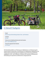 6. Zukunft Stadtgrün Profil: Erneuerung und Entwicklung urbaner Grün- und Freiräume Laufzeit: seit 2017 Volumen der Städtebaufördermittel des Bundes: 2017: rund 50 Millionen Euro Finanzierungsanteil des Bundes: 33,3 Prozent Die Bundesfinanzhilfen zur Förderung von Maßnahmen zur Verbesserung der urbanen grünen Infrastruktur sind bestimmt für städtebauliche Maßnahmen der Anlage, Sanierung beziehungsweise Qualifizierung und Vernetzung öffentlich zugänglicher Grün- und Freiflächen im Rahmen der baulichen Erhaltung und Entwicklung von Quartieren als lebenswerte und gesunde Orte.