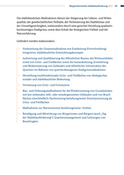 Bürgerinformation Städtebauförderung 2017 29 Die städtebaulichen Maßnahmen dienen der Steigerung der Lebens- und Wohn- qualität, der gesellschaftlichen Teilhabe, der Verbesserung des Stadtklimas und der Umweltgerechtigkeit, insbesondere durch eine gerechte Verteilung qualitativ hochwertigen Stadtgrüns, sowie dem Erhalt der biologischen Vielfalt und der Naturerfahrung. Gefördert werden insbesondere: ∙∙ Vorbereitung der Gesamtmaßnahme wie Erarbeitung (Fortschreibung) integrierter städtebaulicher Entwicklungskonzepte ∙∙ Aufwertung und Qualifizierung des öffentlichen Raums, des Wohnumfeldes sowie von Grün- und Freiflächen sowie die Instandsetzung, Erweiterung und Modernisierung von Gebäuden und öffentlicher Infrastruktur des Quartiers im Rahmen von quartiersbezogenen Stadtgrünmaßnahmen ∙∙ Herstellung multifunktionaler Grün- und Freiflächen von ökologischer, sozialer und städtebaulicher Bedeutung ∙∙ Vernetzung von Grün- und Freiräumen ∙∙ Bau- und Ordnungsmaßnahmen für die Wiedernutzung von Grundstücken mit leer stehenden, fehl- oder mindergenutzten Gebäuden und von Brach- flächen einschließlich Nachnutzung beziehungsweise Zwischennutzung als Grün- und Freiflächen ∙∙ Maßnahmen zur Barrierearmut beziehungsweise -freiheit ∙∙ Beteiligung und Mitwirkung von Bürgerinnen und Bürgern (auch „Tag der Städtebauförderung“), Quartiersmanagement und Leistungen von Beauftragten
