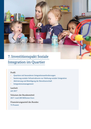 7. Investitionspakt Soziale Integration im Quartier Profil: ∙∙ Quartiere mit besonderen Integrationsanforderungen ∙∙ Sanierung sozialer Infrastrukturen zur Stärkung sozialer Integration ∙∙ Aktivierung und Beteiligung der Bewohnerschaft ∙∙ Integrationsmanagement Laufzeit: seit 2017 Volumen der Bundesmittel: 2017: rund 200 Millionen Euro Finanzierungsanteil des Bundes: 75 Prozent
