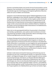 Bürgerinformation Städtebauförderung 2017 31 Quartiere und Nachbarschaften sind zentrale Orte des Zusammenlebens und der Integration. Hier entscheidet sich, ob Integration gelingt. Auch die Aufgaben und Herausforderungen der Unterbringung und Integration geflüchteter Menschen stellen sich zuerst in Städten und Gemeinden. Integration in die Gesellschaft bedeutet gleiche Teilhabemöglichkeiten für alle Menschen, unabhängig von ihrer Herkunft, Hautfarbe und Religion. Inwieweit dies gelingt, hängt auch von der Qualität und dem Angebot sozialer Infrastruk- turen für die vorhandenen und neuen Bewohnerinnen und Bewohner in der Nachbarschaft ab. Gerade Quartiere mit besonderen Integrationsherausforde- rungen werden in den kommenden Jahren erhebliche Bedarfe im Hinblick auf den Ausbau und die Ertüchtigung sozialer Infrastrukturen wie Stadtteilzentren, Stadtteilschulen oder Kitas haben. Daher sind, um den gesamtgesellschaftlichen Zusammenhalt in Deutschland auch künftig zu gewährleisten, unter anderem mehr Investitionen in Erweite- rung, Sanierung und Neubau sozialer Infrastruktur ebenso notwendig wie eine Verbesserung begleitender personeller Ressourcen. Vor diesem Hintergrund hat der Bund 2017 gemeinsam mit den Ländern das neue Förderprogramm „Investitionspakt Soziale Integration im Quartier“ auf- gelegt. Es geht darum, die Kommunen bei ihren Investitionen in die öffentliche soziale Infrastruktur zu unterstützen, um neue Angebote der quartiersbezogenen Integration und des sozialen Zusammenhalts zu schaffen beziehungsweise be stehende Infrastruktur als „neue“ Orte der Integration zu qualifizieren. Das Pro- gramm richtet sich an alle Bewohnerinnen und Bewohner im Quartier, sowohl Menschen mit als auch ohne Migrationshintergrund. Gefördert werden können die bauliche Sanierung und Erweiterung sowie im Einzelfall auch der Ersatz- beziehungsweise Neubau von sogenannten Gemein- bedarfs- und Folgeeinrichtungen, die zur sozialen Integration und zum sozialen Zusammenhalt beitragen. Dies können zum Beispiel öffentliche Bildungsein- richtungen, Kindertagesstätten, Bürgerhäuser, Stadtteilzentren oder weitere Einrichtungen sein, wenn sie eine besondere Bedeutung für die soziale Integra- tion im Quartier haben. Jeweils zugehörige Anlagen und Grün- und Freiflächen können ebenfalls gefördert werden. Voraussetzung ist, dass die Einrichtungen in den Programmgebieten der Städtebauförderung von Bund und Ländern liegen.