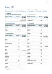 12 1 Anlage 11 Gemeldete Exporte von Kleinwaffen und leichten Waffen an das VN-Waffenregister im Jahr 2014 1. Kleinwaffen 1.1 Revolver und halbautomatische Pistolen 1.3 Maschinenpistolen Endgültiges Einfuhrland Stückzahl Anmerkung Endgültiges Einfuhrland Stückzahl Anmerkung zum Transfer zum Transfer Irak 16.000 Ausstattungshilfe Vereinigtes Königreich 22 an kurdische Regionalregierung Vereinigte Staaten 259 1.2 Gewehre und Karabiner 1.4 Sturmgewehre Endgültiges Einfuhrland Stückzahl Anmerkung Endgültiges Einfuhrland Stückzahl Anmerkung zum Transfer zum Transfer Österreich 1 Brasilien 55 Kanada 48.000 Dänemark 4 Schweiz 1 Kanada 23 Finnland 2 1.3 Maschinenpistolen Frankreich 304 Indonesien 550 Endgültiges Einfuhrland Stückzahl Anmerkung zum Transfer Irak 16.000 Ausstattungshilfe an kurdische Australien 14 Regionalregierung Belgien 39 Irland 1 Bulgarien 10 Italien 39 Kanada 19 Japan 120 Tschechische Republik 82 Jordanien 1.026 Frankreich 77 Luxemburg 4 Indonesien 414 Mali 110 VN-Mission Italien 71 Niederlande 129 Japan 463 Norwegen 3.000 Jemen 4 VN-Mission Polen 540 Jordanien 45 Portugal 78 Malaysia 2 Slowenien 15 Mali 25 VN-Mission Spanien 83 Montenegro 30 Schweden 515 Niederlande 2 Schweiz 13 Norwegen 15 Uruguay 23 Oman 500 Vereinigte Arabische Emirate 30 Polen 284 Vereinigtes Königreich 143 Südafrika 5 Vereinigte Staaten 726 Spanien 75 Schweden 70 Schweiz 30 Vereinigte Arabische Emirate 24