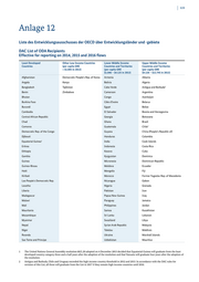 12 3 Anlage 12 Liste des Entwicklungsausschusses der OECD über Entwicklungsländer und -gebiete DAC List of ODA Recipients Effective for reporting on 2014, 2015 and 2016 flows Least Developed Other Low Income Countries Lower Middle Income Upper Middle Income Countries (per capita GNI Countries and Territories Countries and Territories < $1.045 in 2013) (per capita GNI (per capita GNI $1.046 – $4.125 in 2013) $4.126 – $12.745 in 2013) Afghanistan Democratic People's Rep. of Korea Armenia Albania Angola Kenya Bolivia Algeria Bangladesh Tajikistan Cabo Verde Antigua and Barbuda2 Benin Zimbabwe Cameroon Argentina Bhutan Congo Azerbaijan Burkina Faso Côte d'Ivoire Belarus Burundi Egypt Belize Cambodia El Salvador Bosnia and Herzegovina Central African Republic Georgia Botswana Chad Ghana Brazil Comoros Guatemala Chile2 Democratic Rep. of the Congo Guyana China (People's Republic of) Djibouti Honduras Colombia Equatorial Guinea1 India Cook Islands Eritrea Indonesia Costa Rica Ethiopia Kosovo Cuba Gambia Kyrgyzstan Dominica Guinea Micronesia Dominican Republic Guinea-Bissau Moldova Ecuador Haiti Mongolia Fiji Kiribati Morocco Former Yugoslav Rep. of Macedonia Lao People's Democratic Rep. Nicaragua Gabon Lesotho Nigeria Grenada Liberia Pakistan Iran Madagascar Papua New Guinea Iraq Malawi Paraguay Jamaica Mali Philippines Jordan Mauritania Samoa Kazakhstan Mozambique Sri Lanka Lebanon Myanmar Swaziland Libya Nepal Syrian Arab Republic Malaysia Niger Tokelau Maldives Rwanda Ukraine Marshall Islands Sao Tome and Principe Uzbekistan Mauritius 1 The United Nations General Assembly resolution 68/L.20 adopted on 4 December 2013 decided that Equatorial Guinea will graduate from the least developed country category three and a half years after the adoption of the resolution and that Vanuatu will graduate four years after the adoption of the resolution. 2 Antigua and Barbuda, Chile and Uruguay exceeded the high income country threshold in 2012 and 2013. In accordance with the DAC rules for revision of this List, all three will graduate from the List in 2017 if they remain high income countries until 2016.