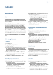 81 Anlage 5 Kriegswaffenliste 14. Kampfhubschrauber, wenn sie mindestens eines der folgenden Merkmale besitzen: 1. integriertes Waffensystem, das insbesondere über Teil A Zielauffassung, Feuerleitung und entsprechende Schnittstellen zur Avionik verfügt, Kriegswaffen, auf deren Herstellung die Bundesrepublik 2. integrierte elektronische Kampfmittel, Deutschland verzichtet hat (Atomwaffen, biologische und 3. integriertes elektronisches Kampfführungssystem chemische Waffen) 15. Zellen für die Waffen der Nummern 13 und 14 16. Strahl-, Propellerturbinen- und Raketentriebwerke für Von der Begriffsbestimmung der Waffen ausgenommen die Waffen der Nummer 13 sind alle Vorrichtungen, Teile, Geräte, Einrichtungen, Substanzen und Organismen, die zivilen Zwecken oder der wissenschaftlichen, medizinischen oder industriellen III. Kriegsschiffe und schwimmende Unterstützungs Forschung auf den Gebieten der reinen und angewandten fahrzeuge Wissenschaft dienen. Ausgenommen sind auch die Sub stanzen und Organismen der Nummern 3 und 5, soweit sie 17. Kriegsschiffe einschließlich solcher, die für die zu Vorbeugungs-, Schutz- oder Nachweiszwecken dienen. Ausbildung verwendet werden 18. Unterseeboote (Teil A der Kriegswaffenliste wird hier nicht wiedergege- 19. kleine Wasserfahrzeuge mit einer Geschwindigkeit von ben.) mehr als 30 Knoten, die mit Angriffswaffen ausgerüstet sind 20. Minenräumboote, Minenjagdboote, Minenleger, Teil B – Sonstige Kriegswaffen Sperrbrecher sowie sonstige Minenkampfboote 21. Landungsboote, Landungsschiffe I. Flugkörper 22. Tender, Munitionstransporter 23. Rümpfe für die Waffen der Nummern 17 bis 22 7. Lenkflugkörper 8. ungelenkte Flugkörper (Raketen) 9. sonstige Flugkörper IV. Kampffahrzeuge 10. Abfeuereinrichtungen (Startanlagen und Startgeräte) für die Waffen der Nummern 7 und 9 einschließlich der 24. Kampfpanzer tragbaren Abfeuereinrichtungen für Lenkflugkörper zur 25. sonstige gepanzerte Kampffahrzeuge einschließlich der Panzer- und Fliegerabwehr gepanzerten kampfunterstützenden Fahrzeuge 11. Abfeuereinrichtungen für die Waffen der Nummer 8 26. Spezialfahrzeuge aller Art, die ausschließlich für den einschließlich der tragbaren Abfeuereinrichtungen Einsatz der Waffen der Nummern 1 bis 6 entwickelt sind sowie der Raketenwerfer 27. Fahrgestelle für die Waffen der Nummern 24 und 25 12. Triebwerke für die Waffen der Nummern 7 bis 9 28. Türme für Kampfpanzer II. Kampfflugzeuge und -hubschrauber V. Rohrwaffen 13. Kampfflugzeuge, wenn sie mindestens eines der folgen- 29. a) Maschinengewehre, ausgenommen solche mit den Merkmale besitzen: Wasserkühlung, 1. integriertes Waffensystem, das insbesondere über b) Maschinenpistolen, ausgenommen solche, die als Zielauffassung, Feuerleitung und entsprechende Modell vor dem 2. September 1945 bei einer militäri- Schnittstellen zur Avionik verfügt, schen Streitkraft eingeführt worden sind, 2. integrierte elektronische Kampfmittel, c) vollautomatische Gewehre, ausgenommen solche, 3. integriertes elektronisches Kampfführungssystem die als Modell vor dem 2. September 1945 bei einer militärischen Streitkraft eingeführt worden sind,