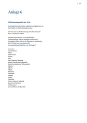 83 Anlage 6 Waffenembargos im Jahr 2014 Nachfolgend sind die Länder aufgeführt, bezüglich derer im Berichtsjahr ein Waffenembargo bestand. Der Kreis der von Waffenembargos betroffenen Länder kann sich jederzeit ändern. Aktuelle Informationen zu den bestehenden Waffenembargos und den jeweiligen (rechtlichen) Grundlagen finden sich auf der Webseite des Bundesamts für Wirtschaft und Ausfuhrkontrolle (www.ausfuhrkontrolle.info) unter „Embargos“. Armenien Aserbaidschan China Côte d‘Ivoire Eritrea Irak Iran, Islamische Republik Kongo, Demokratische Republik Korea, Demokratische Volksrepublik Libanon Liberia Libyen Myanmar Simbabwe Somalia Sudan Südsudan Syrien, Arabische Republik Russische Föderation Weißrussland Zentralafrikanische Republik