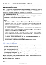 D1-2650/0-1350 Stichworte zur Traditionsbildung und -pflege im Heer Rahmen der Auftragstaktik und einer harten, am Einsatz orientierten Ausbildung sowie einer erwachsenengerechten Erziehung. 631. Hinzu kommen die „Richtlinien zum Traditionsverständnis“ (=> Anlage 4). Sie stellen die eigene Tradition der Bundeswehr unter besonderer Berücksichtigung des Staatsbürgers in Uniform und der Inneren Führung in den Mittelpunkt der Traditionspflege. Der Traditionserlass sagt in Nr. 20: „Die Bundeswehr pflegt eigene Traditionen […]. Dazu gehören vor allem […] das Leitbild des „Staatsbürgers in Uniform“ und die Grundsätze der Inneren Führung […].“ Merke: • Staatsbürger in Uniform und Innere Führung sind die Grundlagen unserer eigenen! st en Tradition. Sie stehen für den nicht nur am Erfolg orientierten, aus Einsicht gehorchenden, gut di motivierten und einsatzbereiten Soldaten in der Demokratie. Die so handelnden Soldaten haben gs sich im Einsatz eindrucksvoll bewährt. ru n de • Der Staatsbürger in Uniform ist ein freier Mensch, verantwortungsbewusster Staatsbürger und Än einsatzbereiter Soldat. Er gehorcht aus Einsicht und ist aus Überzeugung bereit, sein Land zu em verteidigen sowie dem Frieden in der Welt zu dienen. td ic • Innere Führung ist der Führungs-, Ausbildungs- und Erziehungsauftrag zur Umsetzung von h tn Normen und Werten des Grundgesetzes für einsatzbereite Streitkräfte in der Demokratie und eg te zur Verwirklichung des Staatsbürgers in Uniform. rli un • Das Bündnis zwischen demokratischer Idee und soldatischer Notwendigkeit hat sich in k us über 40 Jahren bewährt und eine Tradition begründet. druc • Traditionsbildung und Traditionspflege sind Bestandteil der Inneren Führung. er A ie s 6.3.3 Ausgewählte Literatur D • Abendheim, Donald: Bundeswehr und Tradition – Die Suche nach dem gültigen Erbe des deutschen Soldaten, München, 1989 • Baudissin, Wolf Graf von: Soldat für den Frieden – Entwürfe für eine zeitgemäße Bundeswehr, Hg. Peter von Schubert, München, 1969 • Diefenbach, Karl: Staatsbürger in Uniform – Ausgangspunkt und Ziel der Inneren Führung, Reader Sicherheitspolitik 1/98, Beilage zur IFDT 1/98 • Ilsemann, Carl Gero von: Die Innere Führung in den Streitkräften – Regensburg, 1981 • Reeb, Hans-Joachim, Peter Többicke: Innere Führung von A-Z – Lexikon für militärische Führer, Regensburg, Berlin, Bonn, 1991 • ZDv 10/1 „Innere Führung“, Februar 1993 Seite 40 Stand: März 2015