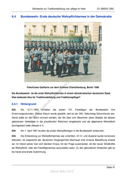 Stichworte zur Traditionsbildung und -pflege im Heer D1-2650/0-1350 6.4 Bundeswehr: Erste deutsche Wehrpflichtarmee in der Demokratie st ! en di gs ru n de Än em td ic h Feierliches Gelöbnis vor dem Schloss Charlottenburg, Berlin 1996 tn eg Die Bundeswehr ist die erste Wehrpflichtarmee in einem demokratischen deutschen Staat. terli Was bedeutet dies für Traditionsbildung und Traditionspflege? un k 6.4.1 Hintergrund us druc 632. Am 12.11.1955 er erhielten die ersten 101 Freiwilligen der Bundeswehr ihre A Ernennungsurkunden. Dieses Datum wurde gewählt, weil es der 200. Geburtstag Scharnhorsts war. ie s Damit sollte an den Mann erinnert werden, der die Idee vom Bewohner eines Staates als dessen D geborenem Verteidiger in die preußischen Reformen eingebracht und als allgemeine Wehrpflicht durchgesetzt hatte (Absatz 6.1). 633. Am 1. April 1957 wurden die ersten Wehrpflichtigen in die Bundeswehr einberufen. 634. Die Entwicklung zur Wehrpflichtarmee war umstritten. Im In- und Ausland wurde kontrovers diskutiert, ob angesichts der deutschen Vergangenheit überhaupt eine erneute Bewaffnung erlaubt sei. Im Inland setzte man sich darüber hinaus mit der Frage auseinander, ob die neuen Streitkräfte als Wehrpflicht- oder als Freiwilligenarmee aufzustellen seien. Zu den gefundenen Antworten gibt es bis heute eine breite Zustimmung. Seite 41 Stand: März 2015