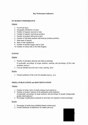 Key Performance Indicators EU BUDGET PERFORMANCE Outputs 1. N u m b e of r users; 2. Geographic distribution of users; 3. Number ofrequests received in total; 4. Number ofrequests received per product; 5. Number of products delivered in total; 6. Number of individual products delivered per product portfolio; 7. Main areas of interest; 8. Index of user satisfaction; 9. Number of satellite images used in total; 1 0 . Number of critical risks in the Risk Register. EVENTS Outputs 1. Number of attendees: physical and online [counting]; If applicable, percentage of target audience counting and percentage of first time attendees [surveyJ 2. Cost per attendee [overall costs (room, catering, all).] Results 1. Overall usefulness of the event for attendees [survey, etc.] MEDIA, PUBLICATIONS and DOCUMENTATIONS Outputs 1. Number of online views of media releases [web analytics] ; 2. Number of readers/ listeners of the publication [web analytics] If applicable: percentage of target audience and percentage of specific demographic groups [desk analysis]; 3. Percentage of publications produced in more than one linguistic version [counting] Results 1. Percentage of media items published [media monitoring]; 2. Overall usefulness of publication for readers [survey];