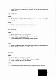 3. Number of readers who thought that the publication was clear and easy to understand [survey, etc.] VIDEOS/PHOTOS Outputs 1. Number of views, embeds and downloads [web analytics, social media metrics, global counting] Results 1. Overall usefulness of the video for the viewer [survey, etc.] SOCIAL MEDIA Outputs 1. Number of impressions [social media metrics]; 2. Number of followers/fans/subscribers [social media metrics]; 3. Number of posts* [social media metrics] Activity indicator used for calculating performance indicators Results 1. Number of engagement: shares, likes, clickthroughs, comments [social media metrics]; 2. Number ofhashtag mentions [social media metrics] WEBSITES Outputs 1. Number of the total of visits [web analytics]; 2. Number of unique visitors identified by browsers [web analytics]; 3. Number of the total page views [web analytics] Results 1. Conversion rate: downloads, registrations, form completed, etc. [web analytics] 4