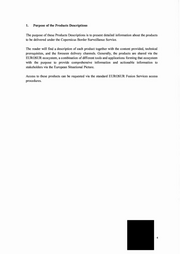 1. Purpose of the Products Descriptions The purpose of these Products Descriptions is to present detailed information about the products to be delivered under the Copernicus Border Surveillance Service. The reader will find a description of each product together with the content provided, technical prerequisites, and the foreseen delivery channels. Generally, the products are shared via the EUROSUR ecosystem, a combination of different tools and applications forming that ecosystem with the purpose to provide comprehensive information and actionable information to stakeholders via the European Situational Picture. Access to these products can be requested via the standard EUROSUR Fusion Services access procedures. 4