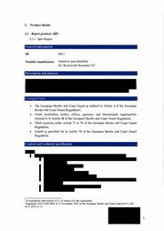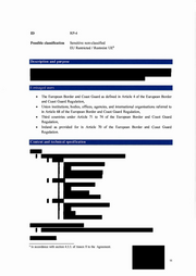 ID RP-4 Possible classification Sensitive non-classified EU Restricted / Restreint UE° Description a n d p u r p o s e E n v i s a g e d users • The European Border and Coast Guard as defined in Article 4 of the European Border and Coast Guard Regulation, • Union institutions, bodies, offices, agencies, and international organisations referred to in Article 68 of the European Border and Coast Guard Regulation, • Third countries under Article 71 to 74 of the European Border and Coast Guard Regulation, • Ireland as provided for in Article 70 of the European Border and Coast Guard Regulation. C o n t e n t a n d t e c h n i c a l specification 6 I n accordance with section 4 . 3 . 3 . of Annex II to the Agreement. 11
