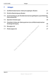 A1-831/0-4002 Anlagen 7 Anlagen 7.1 Schifffahrtmedizinischer Untersuchungsbogen (Muster) 21 7.2 Ärztliche Bescheinigung (Muster) 23 7.3 Zusammenfassung der Borddienstverwendungsfähigkeit ausschließenden Gesundheitsziffer 24 7.4 Spezielle Anforderungen 25 7.5 Checkliste Umfang der Stellungnahmen bei schifffahrtmedizinischen Sondergenehmigung 26 7.6 Bezugsjournal st ! 27 en 7.7 Änderungsjournal sd i 27 ng ru de Än m de ht ic tn eg rli te un k uc dr us rA se ie D Seite 20 Stand: Februar 2017